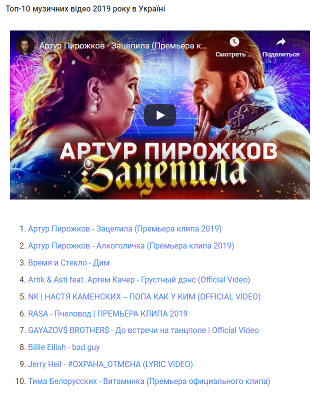 В топ-10 клипов, которые неизменно занимали первые места в трендах, только две видеоработы украинских артистов - это украинская группа Artik & Asti и дуэт Дмитрия Монатика с Верой Брежневой.
