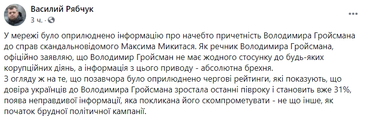 Учитывая же то, что позавчера были обнародованы очередные рейтинги, которые показывают, что доверие украинцев к Владимиру Гройсману росло последние полгода и составляет уже 31%, появление ложной информации, призванной его скомпрометировать - не что иное, как начало грязной политической кампании", - заявил спикер бывшего премьера Василий Рябчук.