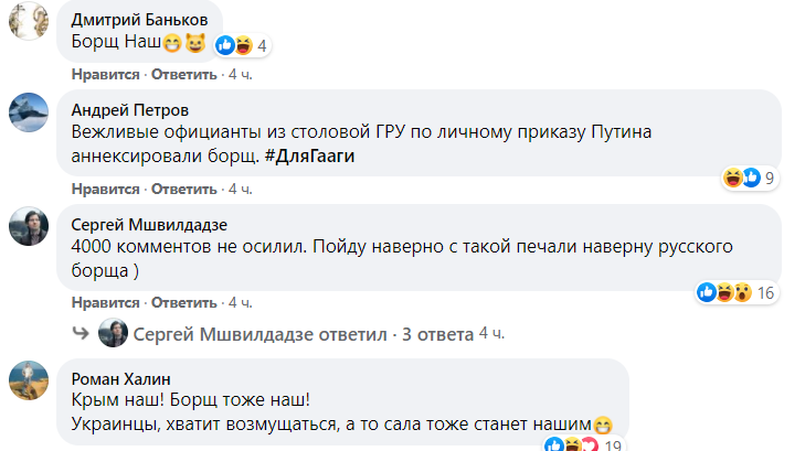 "Борщ принадлежит русским", "Борщ, как и Крым, всегда был, есть и будет русским", "президент Зеленский попросил созвать экстренное совещание Совбеза ООН в связи с аннексией борща Россией", - пишут комментаторы из России.