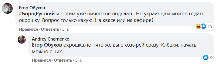 А вчера тему подхватил российский шоумен Андрей Бочаров, который написал пост о "русском борще". На это заявление гневно отреагировали украинские "борще-патриоты". Которых в свою очередь начали троллить россияне, угрожая "вслед за борщом аннексировать сало".
