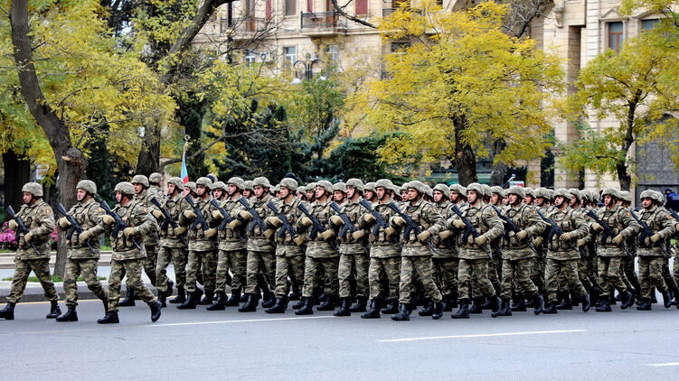 В Баку, на площади Азадлыг, проходит парад победы, посвященный подписанию соглашения с Арменией и Россией касательно завершения военных действий в Карабахе и передаче части территорий региона Азербайджану. В мероприятии принимают участие тысячи азербайджанских и турецких военных.