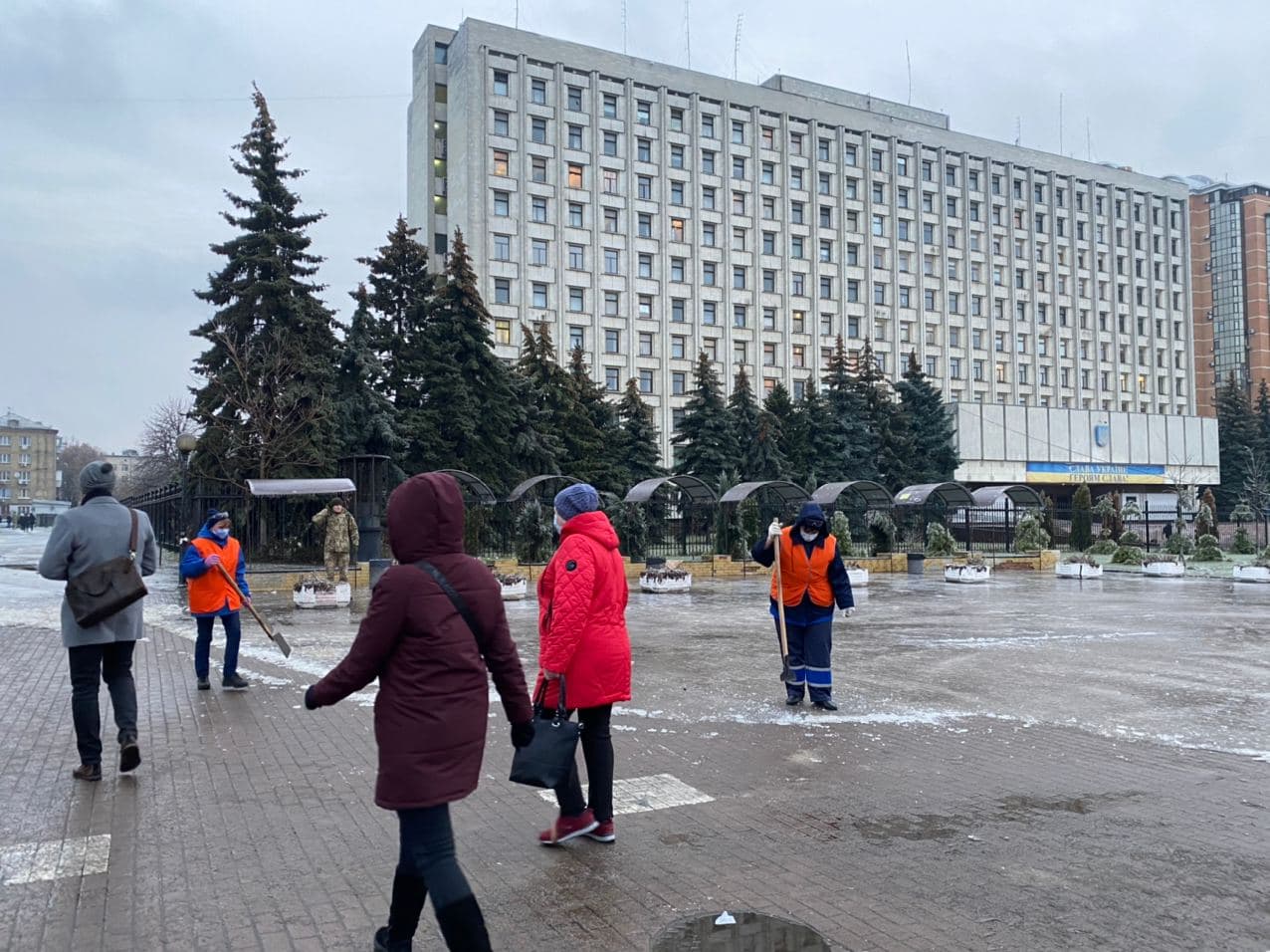 Коммунальные службы утром начали проявлять свое присутствие в городе. Журналисты "Страны" увидели коммунальщиков на площади Леси Украинки, где они лопатами чистили асфальт от обледенения.