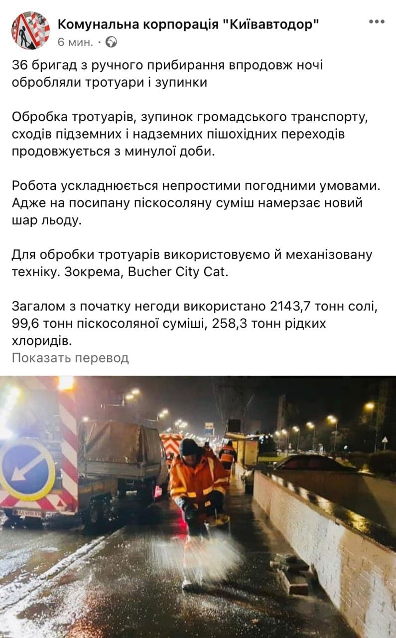 По данным "Киевавтодора", всего в течение ночи 36 бригад вручную обрабатывали тротуары и остановки общественного транспорта, ступени подземных и наземных переходов.