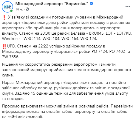 Из-за гололеда рейсы отменил аэропорт "Борисполь", где не смогли принять самолеты и отправили их в резервные аэропорты.