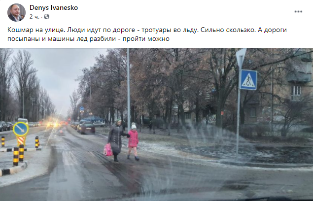 "Кошмар на улице. Люди идут по дороге - тротуары во льду. Сильно скользко. А дороги посыпаны и машины лед разбили - пройти можно".