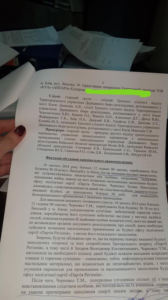 Черновол вручили подозрение в умышленном противоправном причинении смерти другому человеку, совершенном по предварительному сговору группой лиц способом, опасным для жизни многих лиц (п.п. 5, 12, ч. 2 ст. 115 Уголовного кодекса Украины).