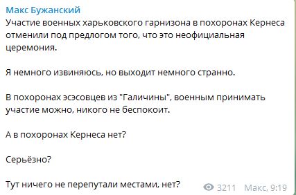 "Я немного извиняюсь, но выходит немного странно. В похоронах эсэсовцев из "Галичины", военным принимать участие можно, никого не беспокоит. А в похоронах Кернеса - нет? Серьёзно? Тут ничего не перепутали местами, нет?"
