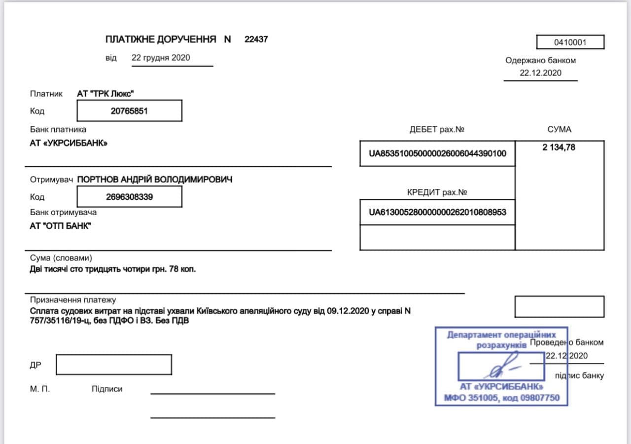 Об этом написал в своем Телеграм сам Портнов, прикрепив к сообщению скан квитанции об оплате издержек.