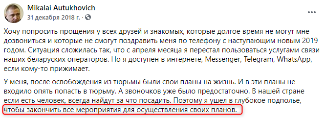 Причем очевидно, что его уход в "подполье" не связан с тем, чтобы избежать ареста: ведь он при этом часто пересекал границу Беларуси, где его спокойно могли задержать. Больше похоже на то, что Автухович пытался скрыть свои контакты и не вывести силовиков на группу, с которой оппозиционер планировал какие-то действия.