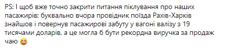 "И чтобы уже точно закрыть вопрос заботы о наших пассажирах: буквально вчера проводник поезда Рахов-Харьков нашел и вернул пассажиру забытый в вагоне чемодан с 19 тысячами долларов", - написал Шевченко, добавив, что это могла бы быть рекордная выручка за продажу чая.