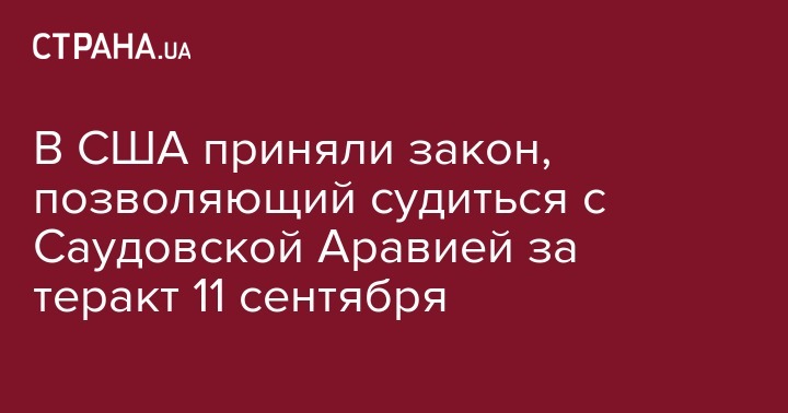 Конгресс США принял закон, позволяющий родственникам жертв атак 11 сентября 2001 года подавать в суд на Саудовскую Аравию. Об этом сообщает ВВС.