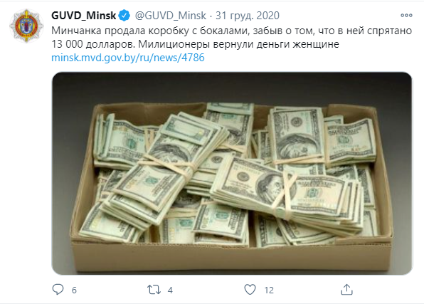 Жительница Беларуси обратилась в милицию после того, как продала бокалы через интернет, отправив их в коробке с 13 тыс. долларов, о которых она забыла.