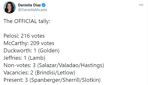 Представитель Демократической партии США Нэнси Пелоси набрала необходимый минимум в 216 голосов. Лидер республиканского меньшинства Кевин Маккарти получил 208 голосов.