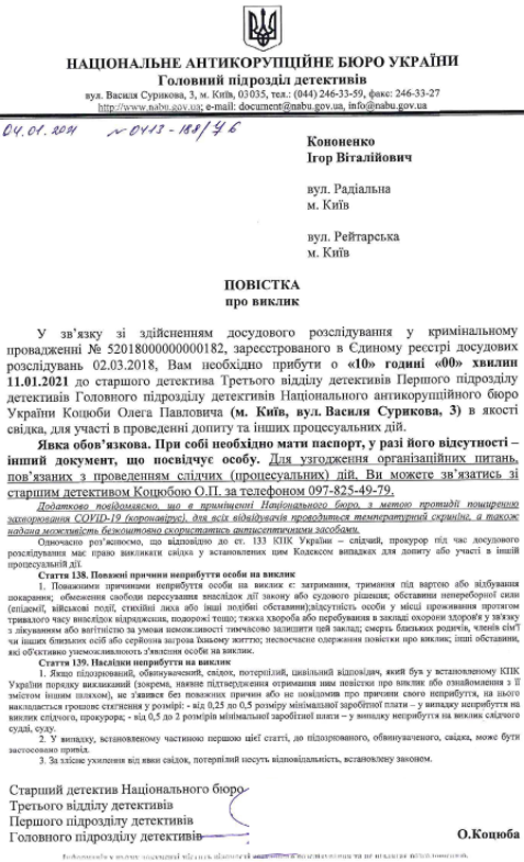 "Учитывая предыдущие неявки без уважительных причин на вызовы публикуем повестку о вызове свидетеля в указанном уголовном производстве Кононенко Игоря Витальевича, зарегистрированного по адресу: ул. Рейтарская, г.Киев, и который проживает по адресу: ул.Радиальная., г. Киев. Вам необходимо прибыть 11.01.2021 года в 10:00...", - говорится в тексте повестки.