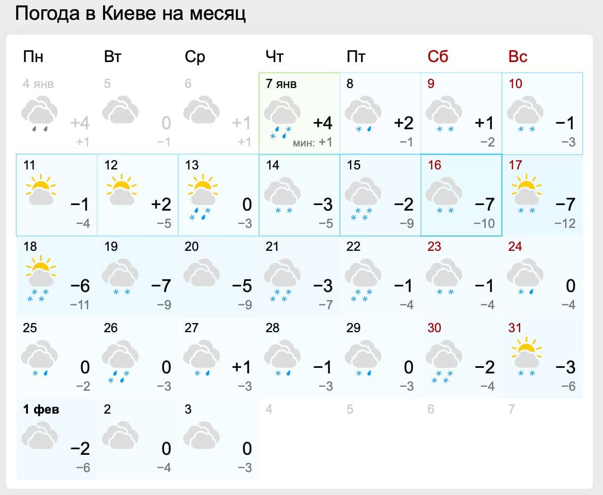 По данным синоптиков Gismeteo, в столице Украины в середине первого месяца Нового года придут морозы до -12 градусов.
