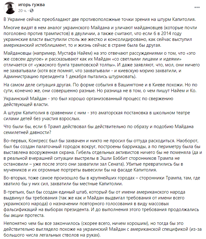 "Тут бывшие функционеры режима Порошенко, блудячий воровской соросятник и прочие герои хищений и массовых беспорядков пытаются сообщить, что события 2014-го года в Украине не очень похожи на вчерашние американские, – что они тогда не захватывали в Украине парламент и еще что-то там не захватывали.