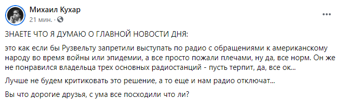 "Это как если бы Рузвельту запретили выступать по радио с обращениями к американскому народу во время войны или эпидемии, а все просто пожали плечами, ну да, все норм. Он же не понравился владельцам трех основных радиостанций – пусть терпит, да, все ок...