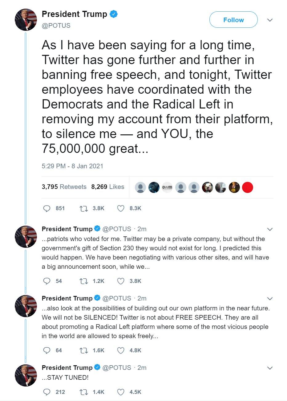 Это началось после того, как трамписты захватили Капитолий. И, хотя сам президент их к таким действиям не призывал (по крайней мере через соцсети), а даже более того - просил очистить здание - интернет-компании отключили Трампа от внешнего мира. Ссылаясь на то, что его заявления могут послужить эскалации насилия.