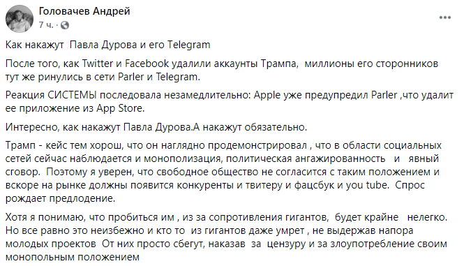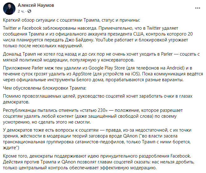 Кроме того, демократы поддерживают идею принудительного раздробления Facebook. Действия против Трампа и QAnon позволят главам соцсетей сказать: нас нельзя дробить, только центральный контроль обеспечивает эффективную модерацию", - пишет Наумов.