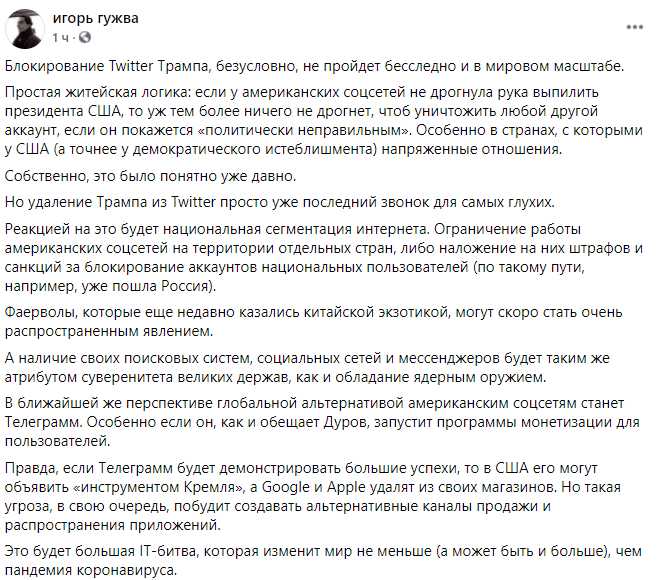"IT-гиганты пошли ва-банк, пытаясь быстрым блицкригом зачистить свои площадки от политически неугодных и диссидентов. Но у этой стратегии есть и обратная сторона - они ещё больше подрывают доверие народа к институтам власти и конституции США, что в перспективе их же и похоронит".