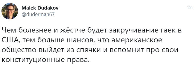 "Чем болезнее и жёстче будет закручивание гаек в США, тем больше шансов, что американское общество выйдет из спячки и вспомнит про свои конституционные права", - прокомментировал этот твит американский политолог Малек Дудаков, сторонник Трампа.