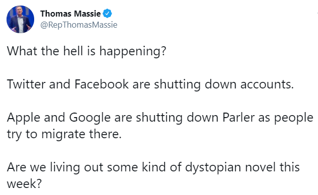 "Что, черт возьми, происходит? Twitter и Facebook закрывают аккаунты. Apple и Google закрывают Parler, поскольку люди пытаются переехать туда. На этой неделе мы переживаем какой-то антиутопический роман?", - пишет конгрессмен Томас Масси.