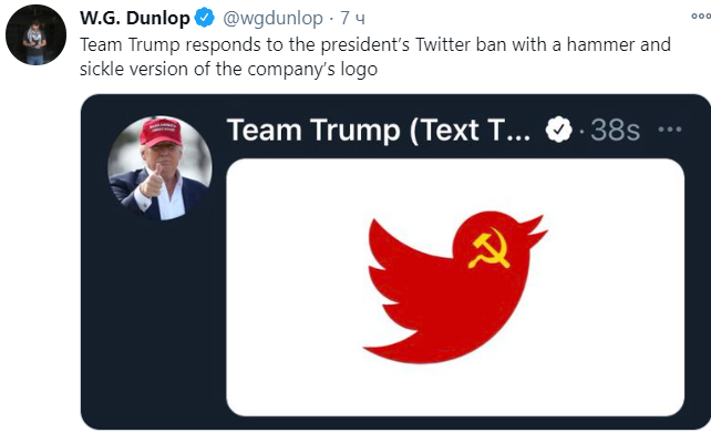 Его штаб потроллил Твиттер, покрасив логотип соцсети в красный цвет и снабдив его серпом и молотом - намекая, что началась коммунистическая цензура. После этого аккаунт Team Trump был также заблокирован.