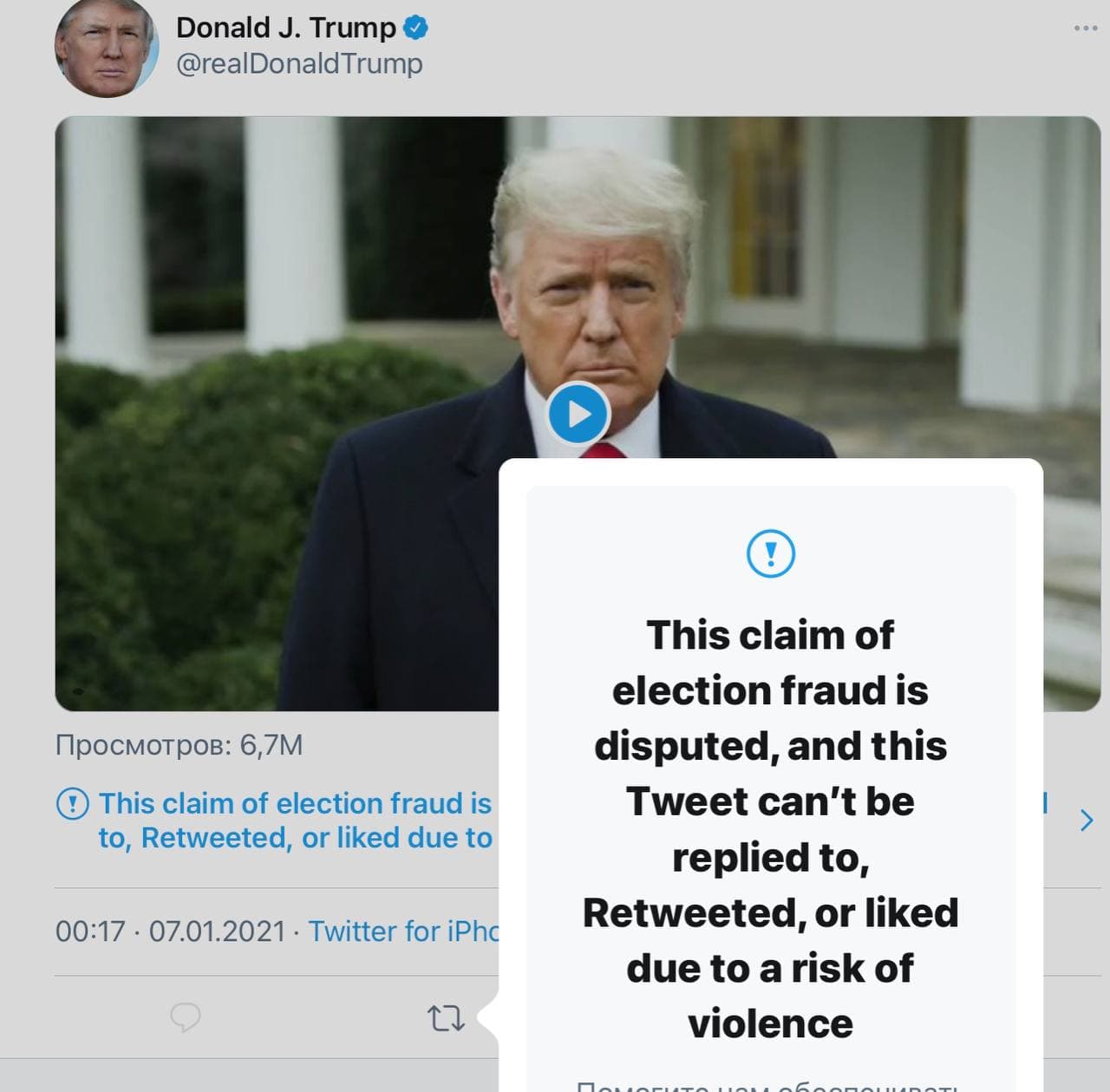 В их числе оказалось и видеообращение Трампа, в котором он призвал своих сторонников разойтись по домам. Твиттерe не понравилось, что президент при этом назвал подсчет голосов "мошенническим". И объявил, что это может привести к насилию.
