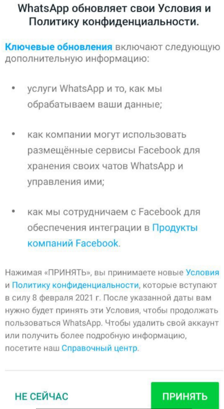 Принимать новую политику по умолчанию предлагают новым пользователям. Также уведомление об этом приходит существующим. Причем говорится, что после 8 февраля без одобрения новой политики приложение работать не будет.