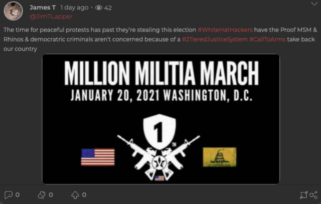 "Время мирных протестов прошло, они украли выборы. Возьмем назад нашу страну", - пишет в Parler пользователь под ником James T, запустивший постер марша и призывающий взять с собой оружие.