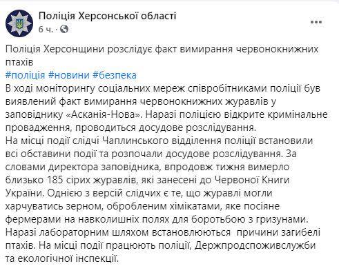 Около 200 журавлей погибли в заповеднике. Фото: facebook.com/AskaniaNovaZapovednik