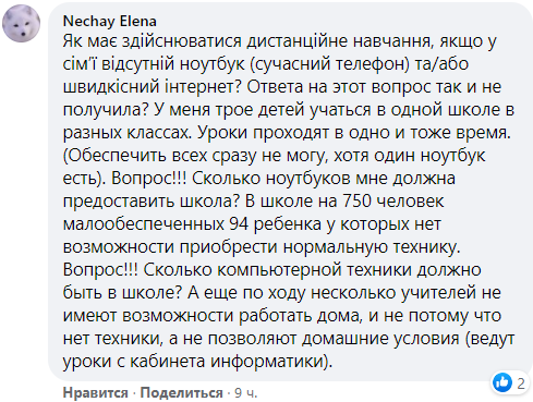 Каждому нужно организовать тихое место для учебы, т.к. дети сидят с включенными микрофонами (отвечать необходимо на вопросы учителей в онлайне), каждому нужен ноут с нормальным интернетом, чтоб не вырубало во время онлайна. Видимо, у тех, кто разрабатывал программу "дистанційного навчання", по одному ребенку, не более", – пишет Юлия Туржанская в группе "Батьки SOS" в "Фейсбуке".