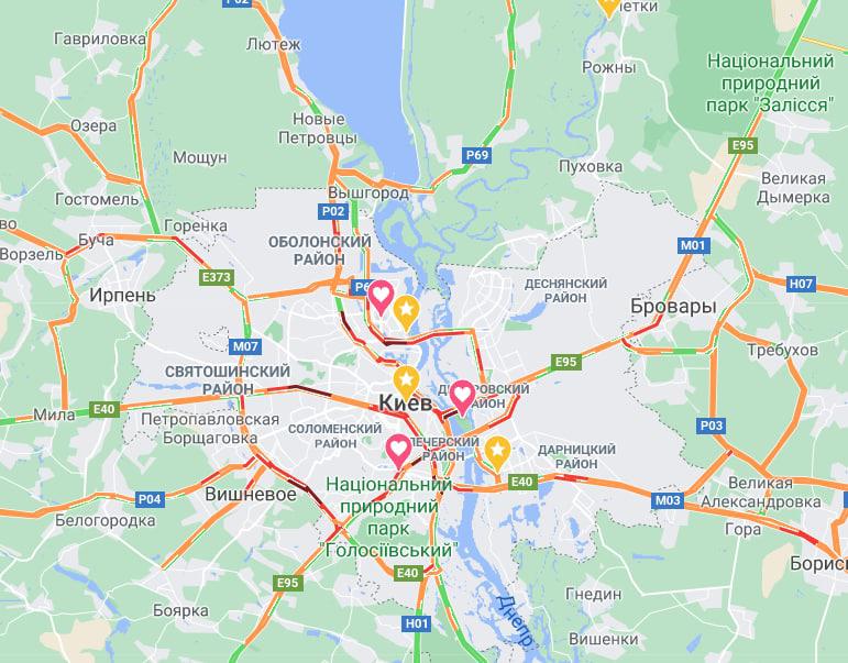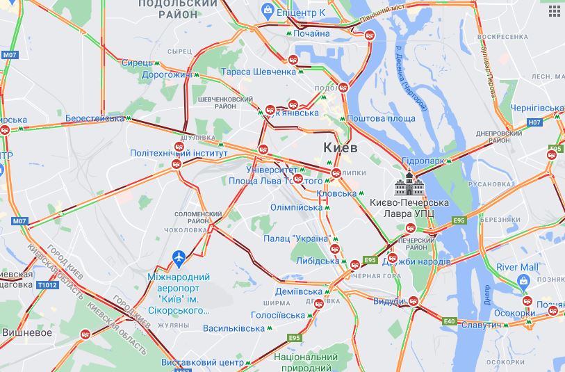 13:58 В Киеве покраснели Вокзальная площадь, Тараса Шевченко, Бассейная, Жилянская, Антоновича.