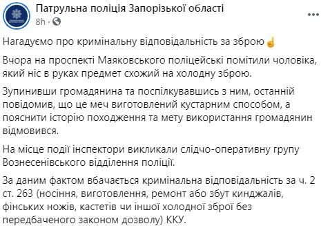 Как сообщает патрульная полиция, остановив гражданина и пообщавшись с ним, последний рассказал, что это меч и изготовлен кустарным способом, а объяснить историю происхождения и цели использования гражданин отказался.