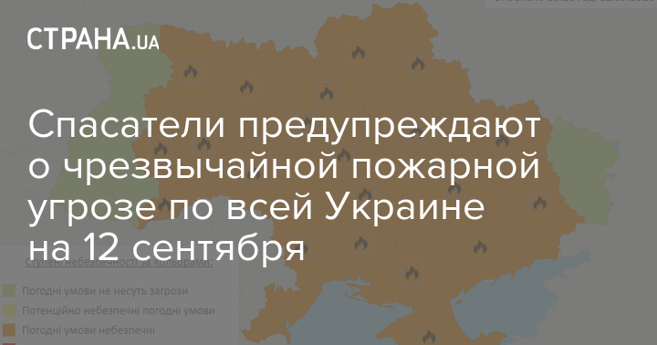 "По прогнозам Укргидрометцентра, 11-12 сентября почти по территории Украине, кроме Закарпатской, Львовской, Ивано-Франковской, Волынской, Донецкой и Луганской областей, будет существовать угроза чрезвычайная пожарная опасность", - говорится в сообщении.
