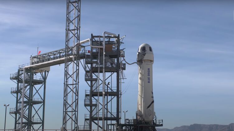 Вид на многоразовую ракету-носитель New Shepard с пассажирской капсулой за секунду до запуска. Скриншот с видео