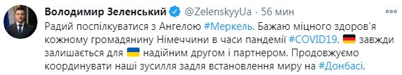 "Рад пообщаться с Ангелой Меркель. Желаю крепкого здоровья каждому гражданину Германии во времена пандемии COVID-19. Германия всегда остается для Украины надежным другом и партнером. Продолжаем координировать наши усилия для установления мира на Донбассе", - написал Зеленский в соцсети Twitter.