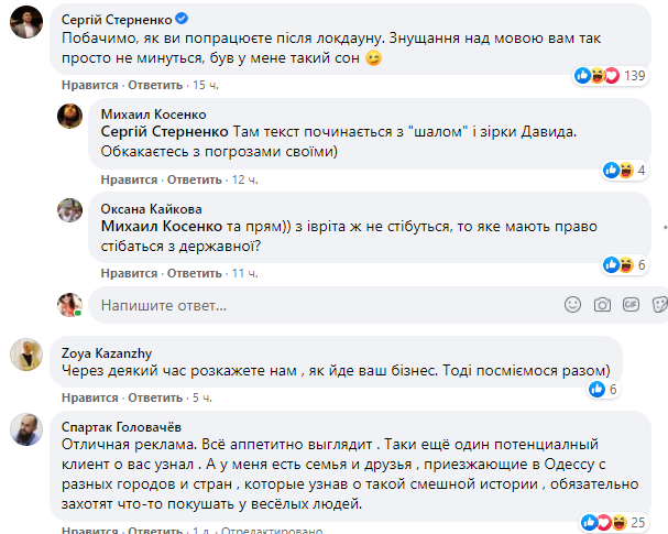 "Посмотрим, как вы поработаете после локдауна. Издевательства над языком вам так просто не пройдут, был у меня такой сон", - написал он в комментарии под постом ресторана.