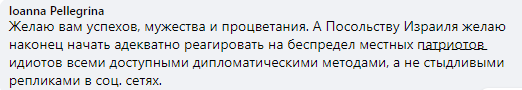 "Желаю вам успехов, мужества и процветания. А посольству Израиля желаю наконец начать адекватно реагировать на беспредел местных "патриотов" идиотов всеми доступными дипломатическими методами, а не стыдливыми репликами в соц. сетях".