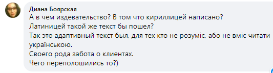 "А в чем издевательство? В том, что кириллицей написано? Латиницей такой же текст бы пошел?", - замечает одесситка Диана Боярская.