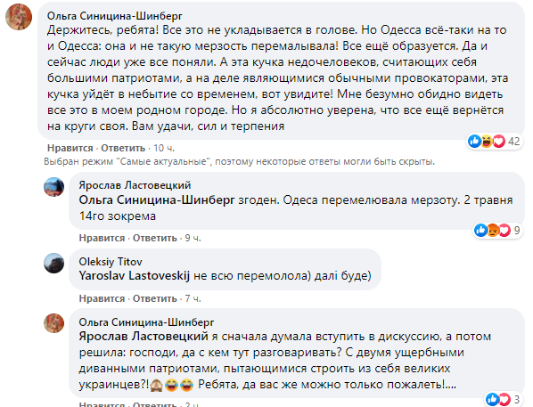 "Держитесь, ребята! Все это не укладывается в голове. Но Одесса всё-таки на то и Одесса: она и не такую мерзость перемалывала! Все ещё образуется. Да и сейчас люди уже все поняли. А эта кучка недочеловеков, считающих себя большими патриотами, а на деле являющимися обычными провокаторами, эта кучка уйдёт в небытие со временем, вот увидите! Мне безумно обидно видеть все это в моем родном городе. Но я абсолютно уверена, что все ещё вернётся на круги своя. Вам удачи, сил и терпения", - пишет одесситка Ольга Синицына.