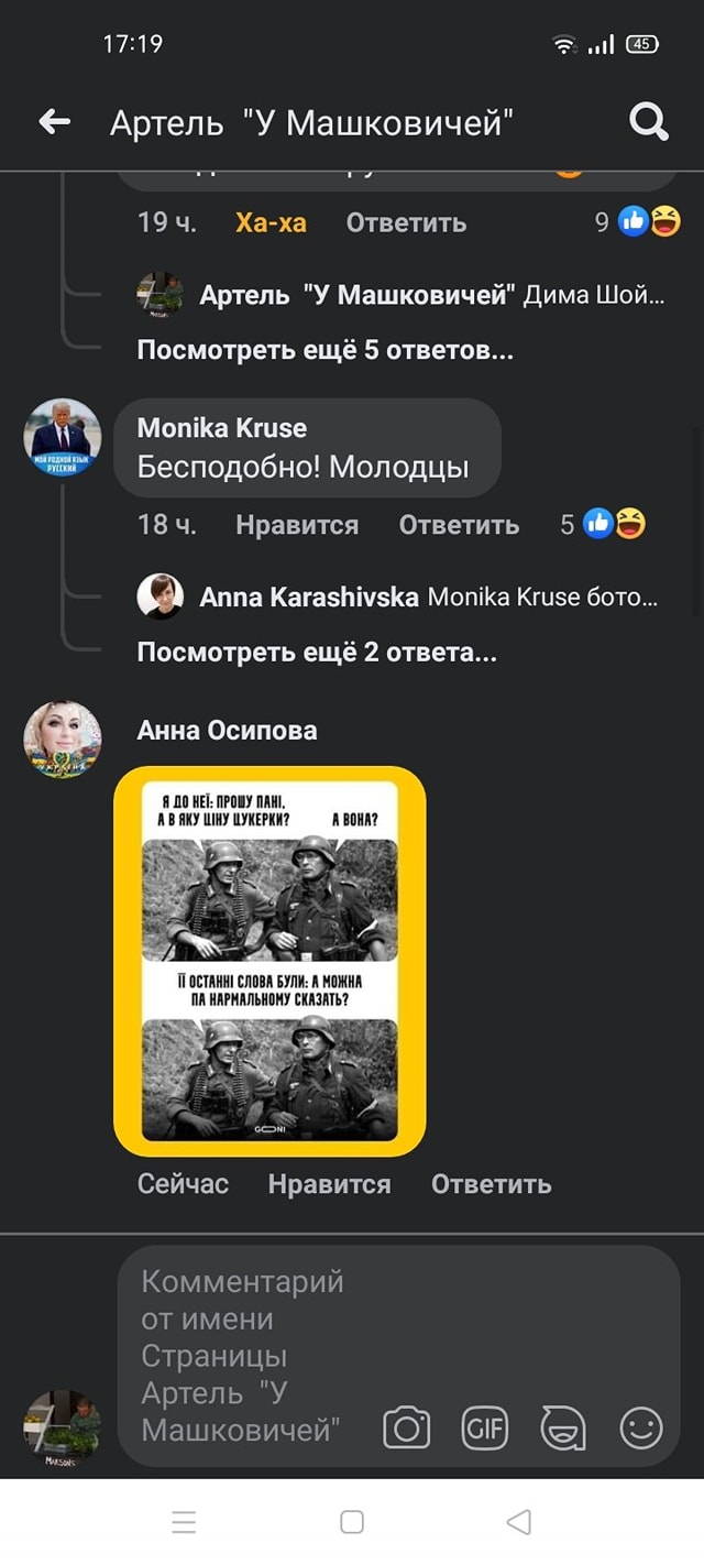 Также владельцы заведения опубликовали скриншоты с угрозами. Пользователи пишут, что в ресторане скоро произойдет "учебный пожар", постят фото нацистов с подписью "Мовный патруль" и "А мы к вам". И так далее.