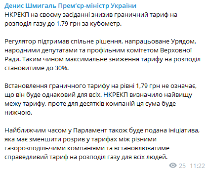 "НКРЭКУ на своем заседании снизил предельный тариф на распределение газа до 1,79 грн за кубометр. Регулятор поддержал общее решение, наработанное правительством, народными депутатами и профильным комитетом Верховной Рады", - сообщил он.