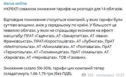 "В большинстве это небольшие облгазы, у которых не срабатывает экономия на эффекте масштаба... Снижение составило 5%-30%, тарифы этих компаний теперь будут составлять 1,66-1,79 грн (без НДС)", - написал Герус в своем Telegram-канале.