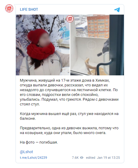 Как рассказала медикам скорой выжившая девочка, они с подругой выпали из с балкона случайно, когда встали на стулья, чтобы посмотреть на город. Однако, не исключена версия, что девочки сами прыгнули вниз.