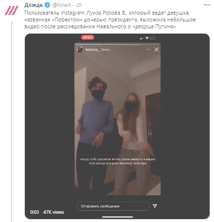 Предполагаемая дочь президента России Владимира Путина, подписанная в Инстаграме Луиза Розова подписалась на аккаунт оппозиционера Алексея Навального и опубликовала видео, которое СМИ связали с расследованием, касающимся "дворца Путина", которое опубликовал днем ранее фонд Навального.