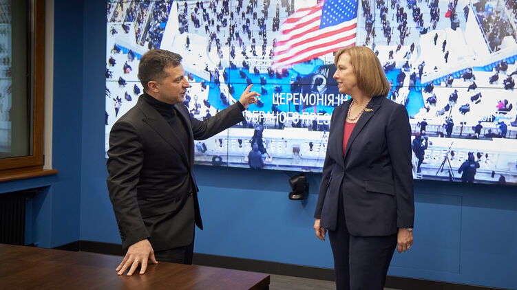 Президент Украины Владимир Зеленский и руководитель Офиса президента Андрей Ермак смотрели инаугурацию 46-го президента США Джо Байдена в компании временной поверенной Соединенных Штатов в Украине Кристиной Квин.