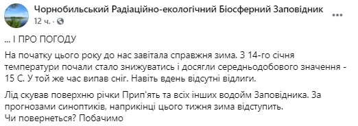 В Чернобыльской зоне в начале текущего года пришла настоящая зима, как по всей Украине. С 14-го января температура воздуха начала снижаться и достигла среднесуточного значения -15 градусов.