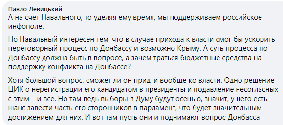 Хотя большой вопрос, сможет ли он прийти вообще ко власти. Одно решение ЦИК о нерегистрации его кандидатом в президенты и подавление несогласных с этим – и все. Но там ведь выборы в Думу будут осенью, значит, у него есть шанс завести часть его сторонников в парламент, что будет значительным достижением для них. И вот там пусть они и поднимают вопрос Донбасса", - пишет журналист Павел Левицкий.