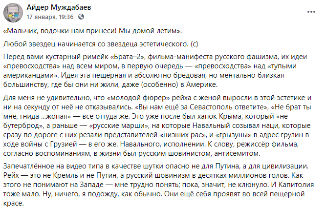 "Для меня не удивительно, что "молодой фюрер" рейха с женой выросли в этой эстетике и ни на секунду от неё не отказывались. "Вы нам ещё за Севастополь ответите", "Не брат ты мне, гнида ...жопая" — всё оттуда же. Это уже после был хапок Крыма, который "не бутерброд", а раньше — "русские марши", на которые Навальный созывал наци, которые сразу по дороге с них резали представителей "низших рас", и "грызуны" в адрес грузин в ходе войны с Грузией — в его же, Навального, исполнении. К слову, режиссёр фильма, согласно воспоминаниям, в жизни был русским шовинистом, антисемитом.
